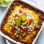 The fresh toppings are what really bring this casserole to life. The shredded iceberg lettuce and chopped white onions add a cool crunch, while the juicy vine tomato offers a fresh burst of sweetness. Don’t forget the dill pickle chips! Their briny crispness contrasts perfectly with the creamy sauce and melted cheese.