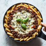 Now it’s time to bring it all together. Add the cooked penne pasta directly into the skillet with the sauce, tossing gently to ensure every piece of pasta is coated in that luscious tomato and beef mixture. Sprinkle the shredded mozzarella and grated Parmesan over the pasta and fold gently to combine, setting the stage for the cheese to melt perfectly in the next step.