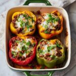 Classic stuffed bell peppers filled with a savory mixture of ground beef or turkey, cooked rice, tomatoes, and melted cheese, baked to perfection for a hearty and comforting meal.