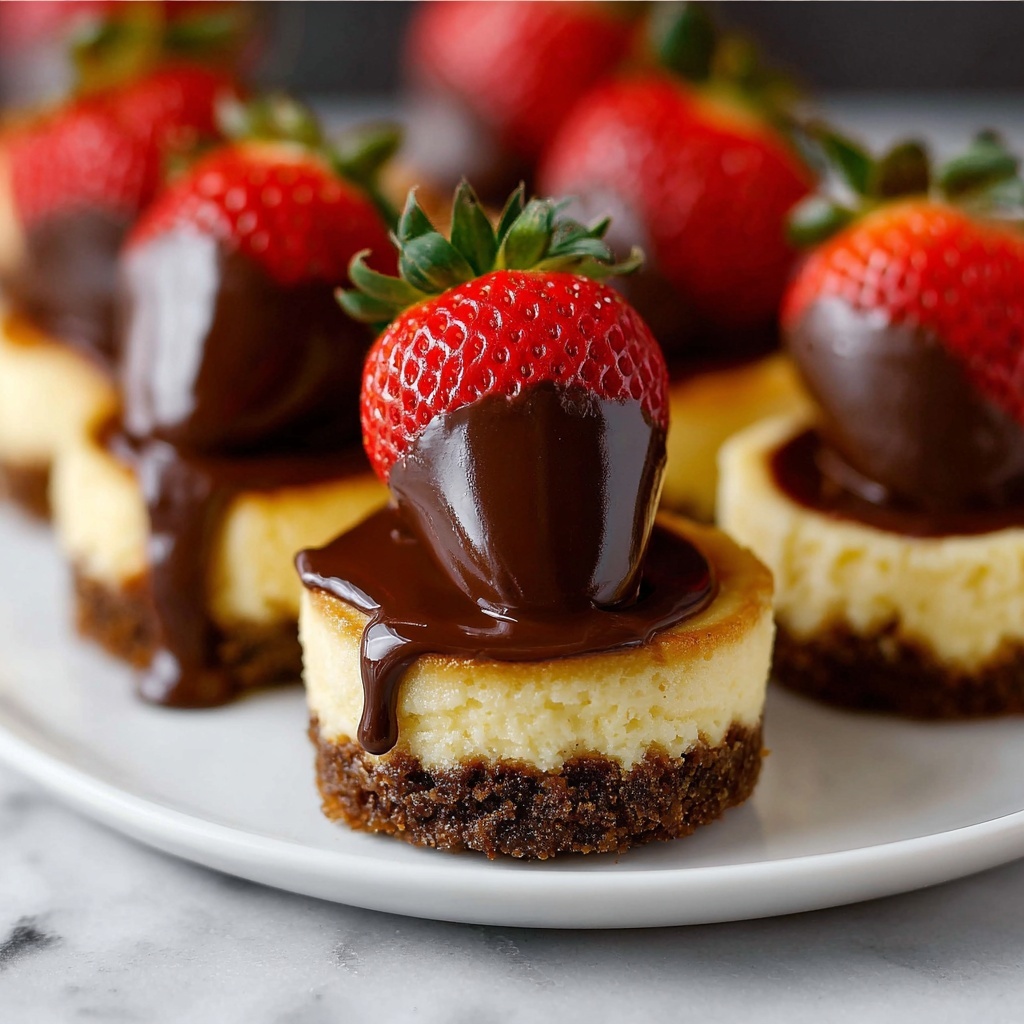 These Chocolate-Dipped Strawberry Mini Cheesecakes combine a buttery graham cracker crust with a smooth, creamy cheesecake filling, topped with luscious melted milk chocolate and fresh strawberries for an irresistible dessert perfect for any occasion.