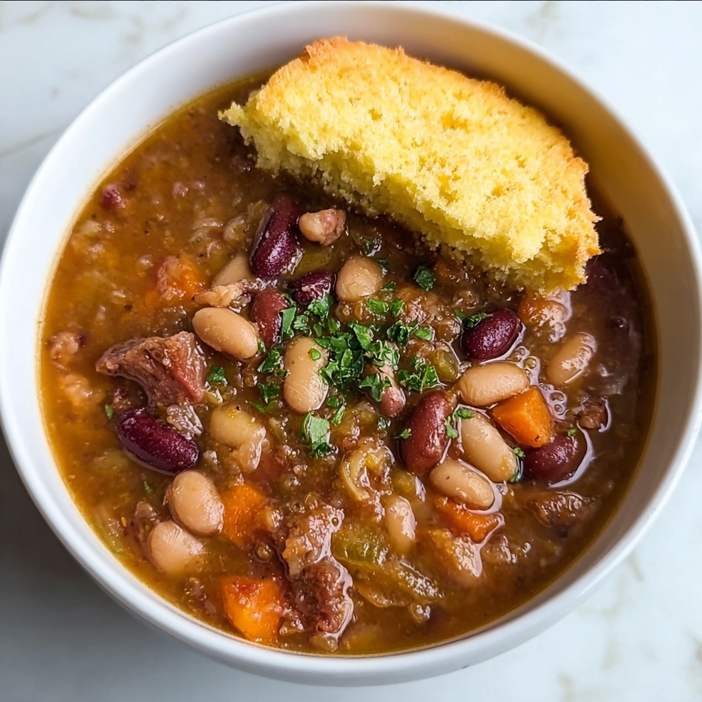 This hearty Crockpot Bean Soup recipe is a flavorful, slow-cooked dish featuring tender beans simmered with aromatic vegetables, herbs, and spices. Perfect for a comforting meal, it can be easily adapted to a vegetarian version using vegetable broth. The soup is thickened to your liking by partially pureeing with an immersion blender and garnished with fresh parsley for added brightness.