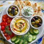 A vibrant and easy-to-assemble Greek hummus platter featuring creamy hummus and tzatziki, fresh vegetables, olives, and pita bread, perfect for an impressive appetizer or light meal in just 15 minutes.