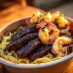 This Mouthwatering Calabrian Steak and Shrimp Bucatini Delight combines tender, thinly sliced sirloin or ribeye steak and succulent shrimp with the bold, spicy flavors of Calabrian chili paste. Tossed with al dente bucatini pasta in a garlic butter sauce with a fresh kick of lemon juice, this dish offers a perfect balance of heat, richness, and freshness for an unforgettable Italian-inspired seafood and steak pasta experience.
