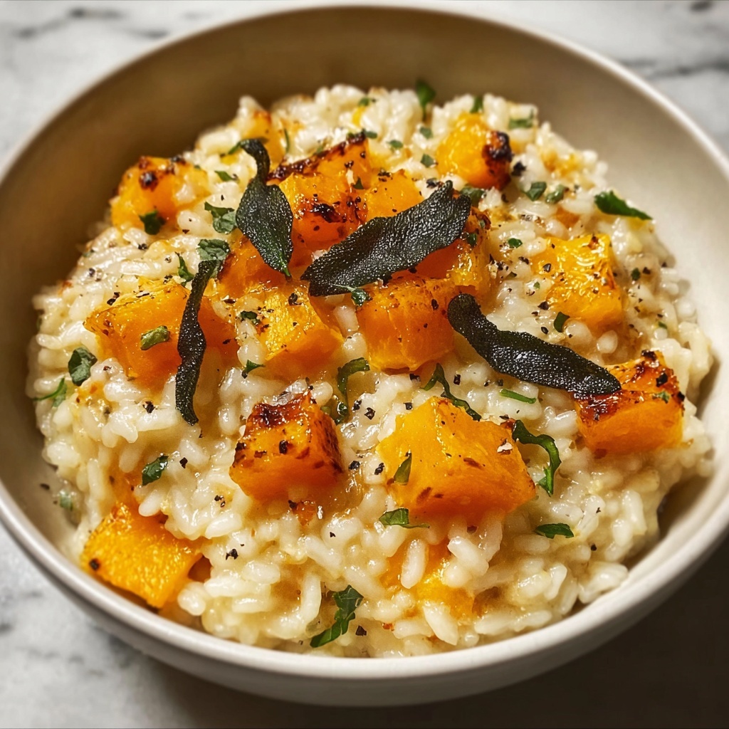 For a stunning presentation, serve the risotto in shallow bowls topped with sage leaves and a small sprig of fresh thyme. Alternatively, fill hollowed-out butternut squash halves with the risotto for an eye-catching, rustic centerpiece that adds extra charm and makes for a wonderful conversation starter at dinner parties.