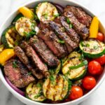 This Sizzling Steak with Roasted Veggies recipe combines tender slices of sirloin steak with a vibrant medley of zucchini, yellow squash, cherry tomatoes, and red onion. Perfectly seasoned and cooked to sizzling perfection, this dish offers a delicious balance of protein and vegetables in just 30 minutes, making it an ideal weeknight dinner for four.