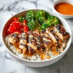 Sticky Chicken Rice Bowls combine tender, flavorful chicken thighs marinated in a sweet and savory sauce, served over fluffy long-grain white rice, and topped with fresh vegetables and toasted sesame seeds. This easy-to-make recipe is perfect for a quick weeknight dinner, offering a balanced and delicious meal with a harmonious blend of textures and flavors.