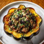 This Stuffed Acorn Squash recipe is a hearty and flavorful fall dish featuring roasted acorn squash halves filled with a savory mix of quinoa, black beans, sweet corn, and sautéed vegetables. Topped with melted cheese and optionally garnished with fresh cilantro, this recipe serves as a delightful vegetarian meal perfect for cozy dinners.