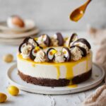 Create the vegan creme egg yolk mixture by whisking together sweetened condensed coconut milk, powdered sugar, and turmeric until smooth and golden. Whip the chilled coconut cream until fluffy, then pipe or spoon little nests around the cheesecake’s top. Fill these creamy nests with your vibrant “yolk” mixture, and finish off with the vegan creme eggs and mini eggs nestled perfectly for a stunning finish.