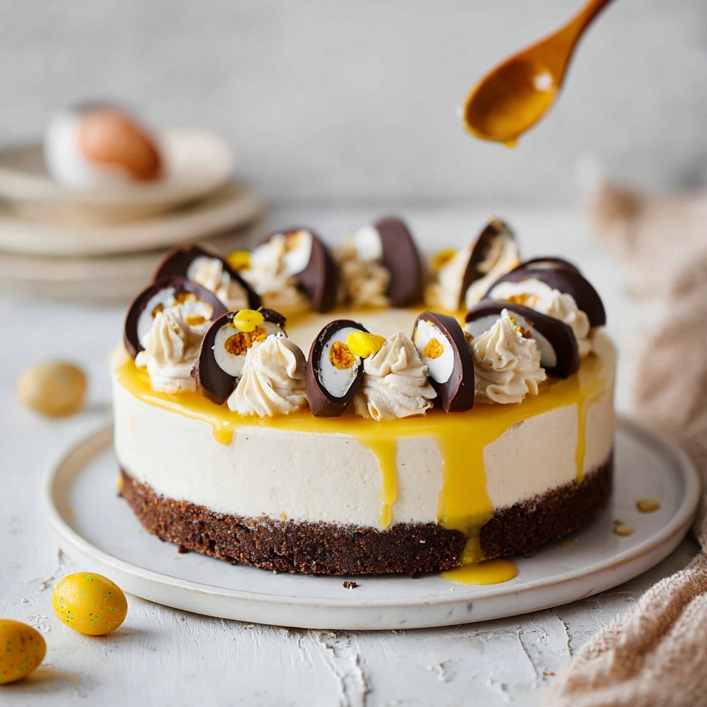 This Vegan Creme Egg Cheesecake is a decadent, no-bake treat perfect for celebrations and chocolate lovers alike. Combining a crunchy vegan cookie crust with a creamy cashew and vegan cream cheese filling, it is topped with a luscious butterscotch center and vegan creme eggs for an impressive, festive look. The recipe uses wholesome plant-based ingredients, making it suitable for vegans and perfect for those seeking a dairy-free dessert option.